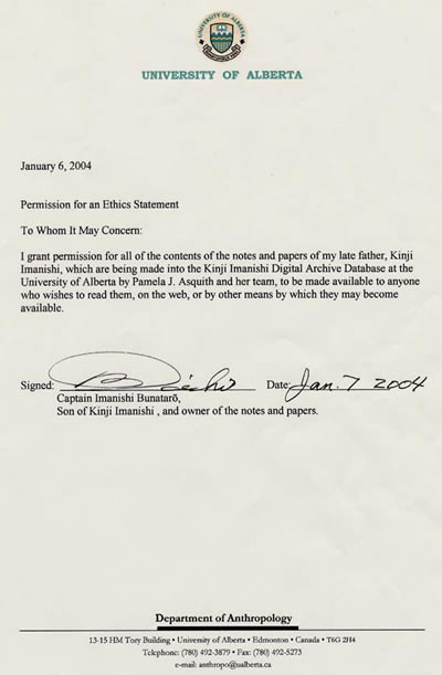 This archive was given exclusive priviledge by Bunatar IMANISHI, Kinji IMANISHI's son, to publish and house these electronic representations of Kinji Imanishi's unpublished private works, which were found in his family home. A copy of this written permission is available below.